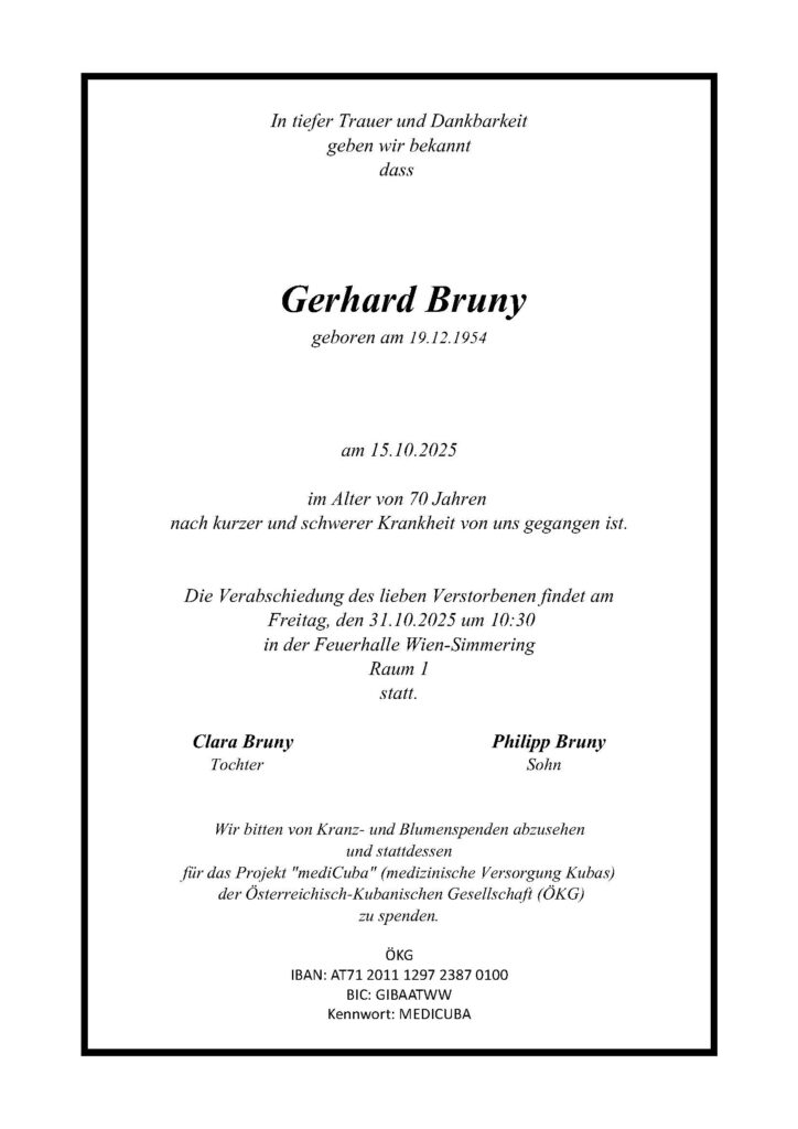 1, Simmeringer Hauptstraße 337, 1110 Wien. Die Angehörigen bitten von Kranz- und Blumenspenden abzusehen und stattdessen für das Projekt “mediCuba” (medizinische Versorgung Kubas) der Österreichisch-Kubanischen Gesellschaft (ÖKG) zu spenden.